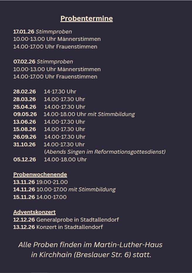 Der Kirchenchor trifft sich mittwochs von 19.30 bis 21 Uhr (außer in den Schulferien) im Martin-Luther-Haus (Breslauer Str.4).